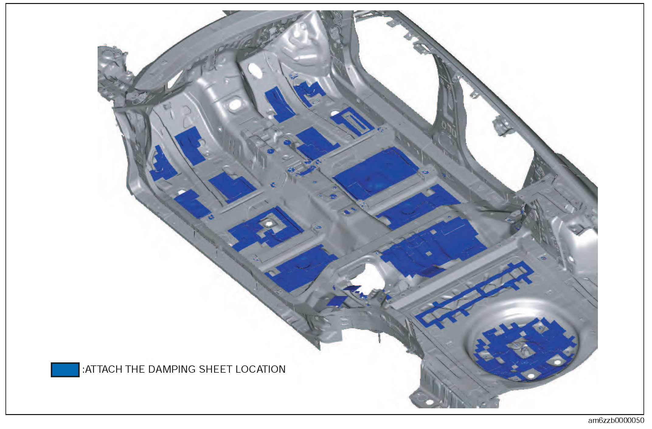 After repairing the body, attach the damping sheet to the location shown in the figure for noise insulation.
