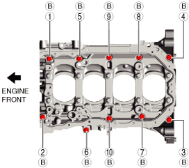2. Loosen the lower cylinder block installation bolts B in two or three passes in the order shown in the figure and remove them.
