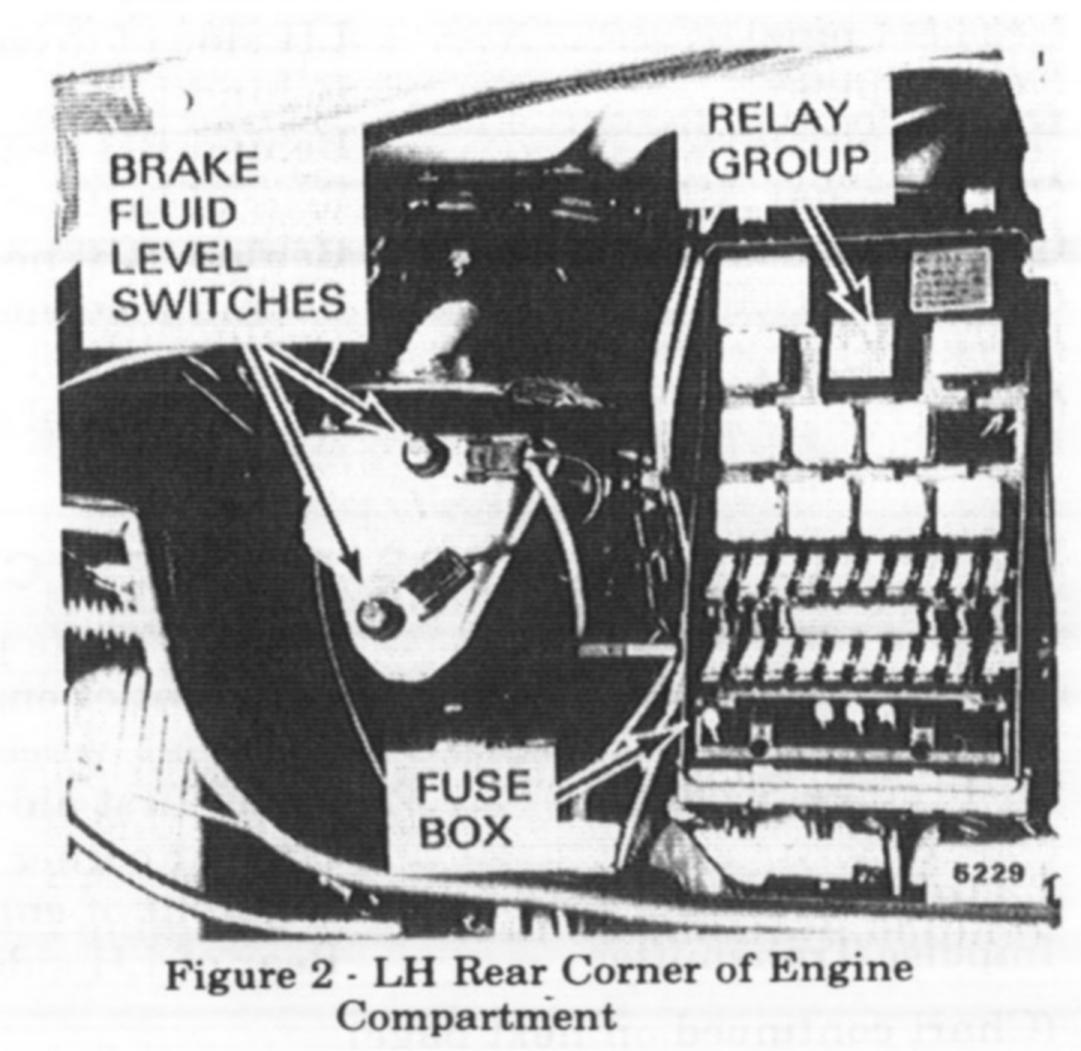 The fuse/relay box is located in the left rear corner of the engine compartment.