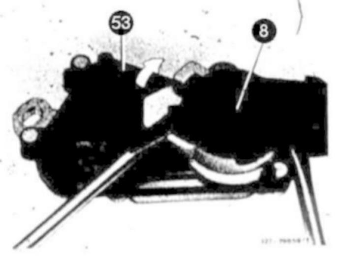 Removal1 Loosen detent for plug of starter lockout switch (8), while turning white plastic ring (arrow) upwards in direction of arrow.