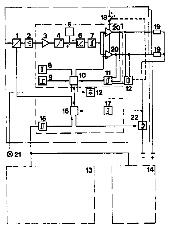 The acceleration sensor (1) in the control unit records the deceleration or acceleration acting on the vehicle on the longitudinal direction. and generates a signal. This signal is sent via the high-pass filter (2) to the amplifier (3) which adapts the signal strength to the following processing stages. The acceleration signal is restricted in the limiter (4) and is reduced by a constant acceleration threshold (as) in a subtractor circuit (5).