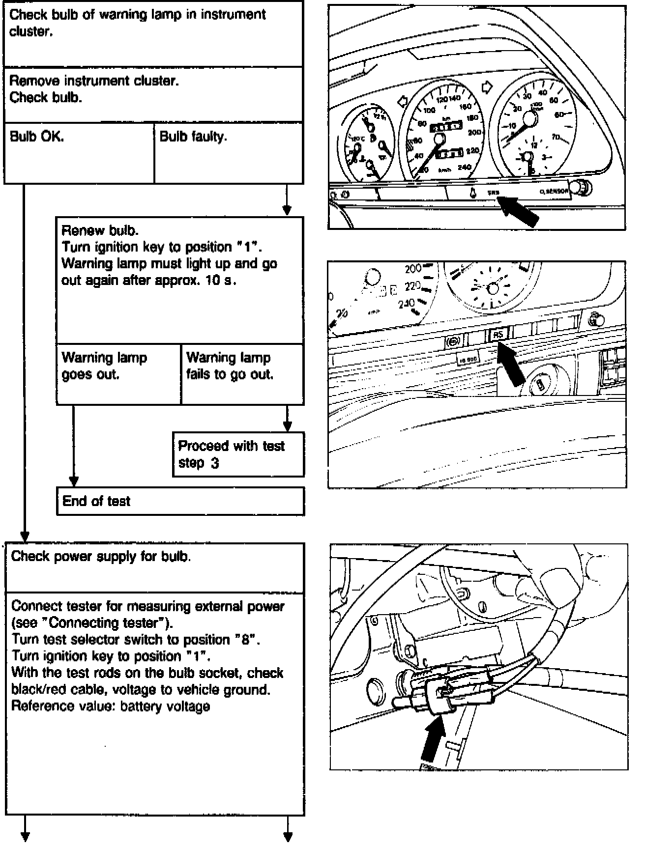 Before testing with the tester, the airbag restraint system must be tested by means of the RS/SRS warning lamp (A1e15). With the ignition switched on, the RS/SRS warning lamp should light up for approx. 10 s. If necessary, check warning lamp or cable.