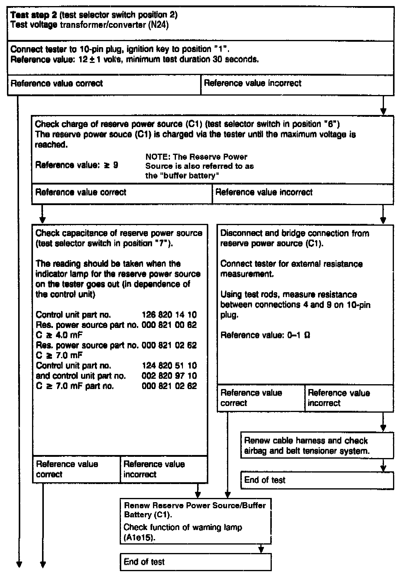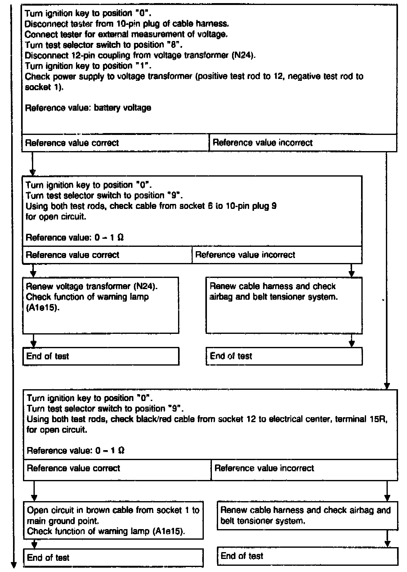 WARNING: Each time before disconnecting the red test coupling/plug connection for airbag, 10-pin (X29/9), to connect the tester, the ignition key must be turned to position "0", the negative terminal of the battery disconnected and covered. Then reconnect the battery for the test.