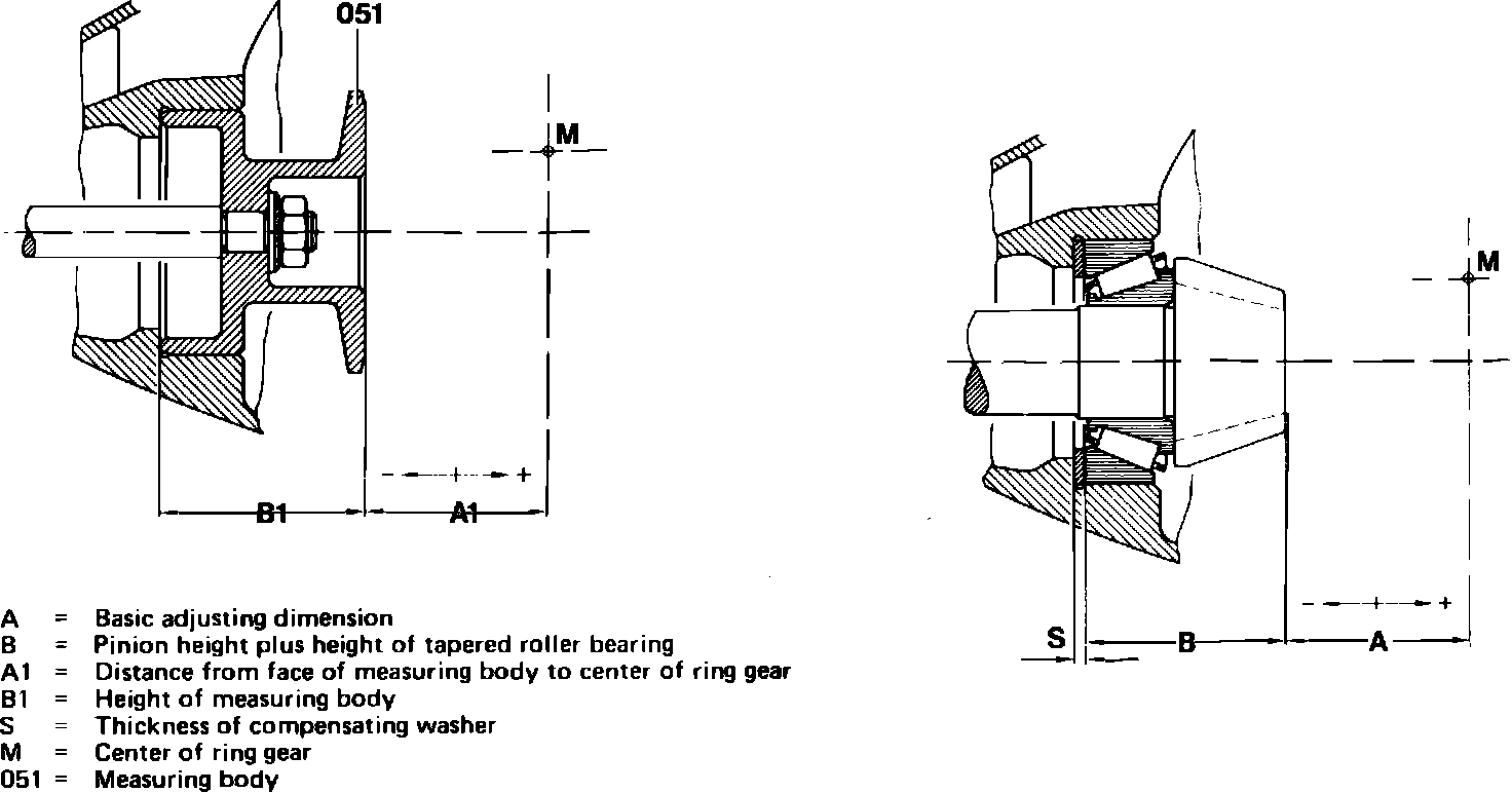 a. Determine compensating washer thickness to be used with a small center piece and a drive pinion height of 1.4 inch (37.5 mm). The difference between measuring body height ``B1'', Fig. 4 and pinion height with bearing ``B'' is .055 inch (1.4 mm). Allowable pinion deviation, which is stamped on the pinion, is + .007 inch (0.20 mm).