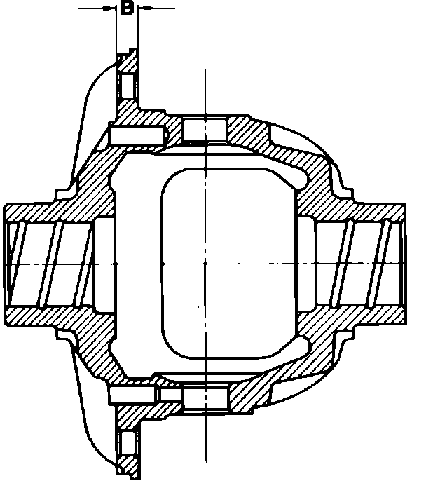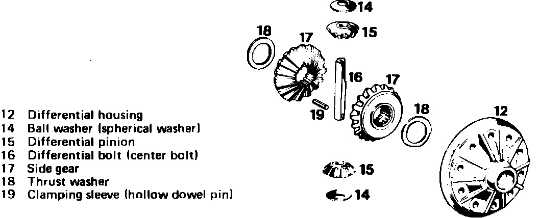 b. Install thrust washers (18), Fig. 6, onto side gears (17). Position both side gears and washers assemblies onto the mandrels and into differential housing (12). The differential ball washers of the present production model ``B,'' are provided with a collar at the outside diameter, Fig. 7, and the differential pinions with a shoulder (arrow).