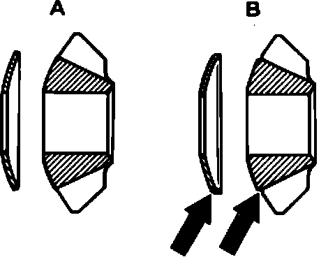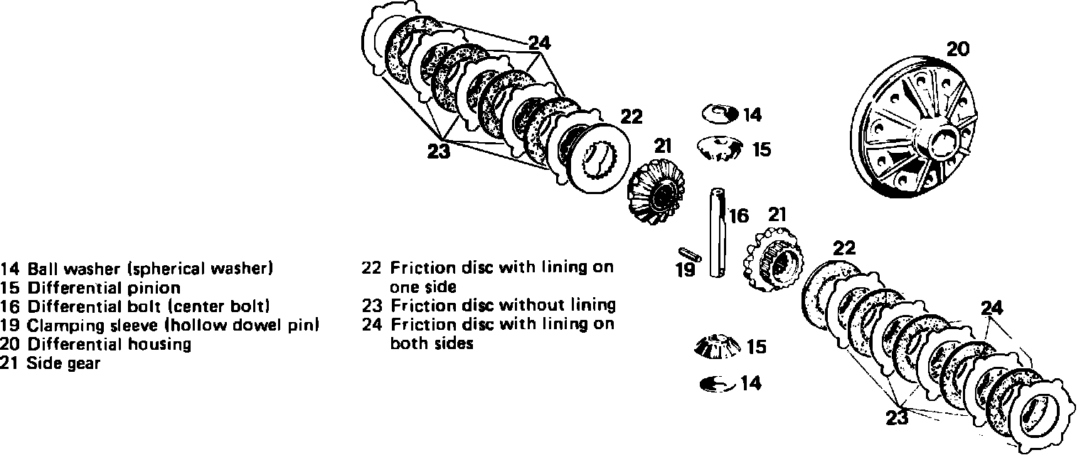 b. Insert left hand side gear and friction disc assembly into mandrel, and install into differential housing. Install right hand side gear with friction discs into differential housing. The differential ball washers of the present production model ``B,'' are provided with a collar at the outside diameter, Fig. 7, and the differential pinions with a shoulder (arrow).