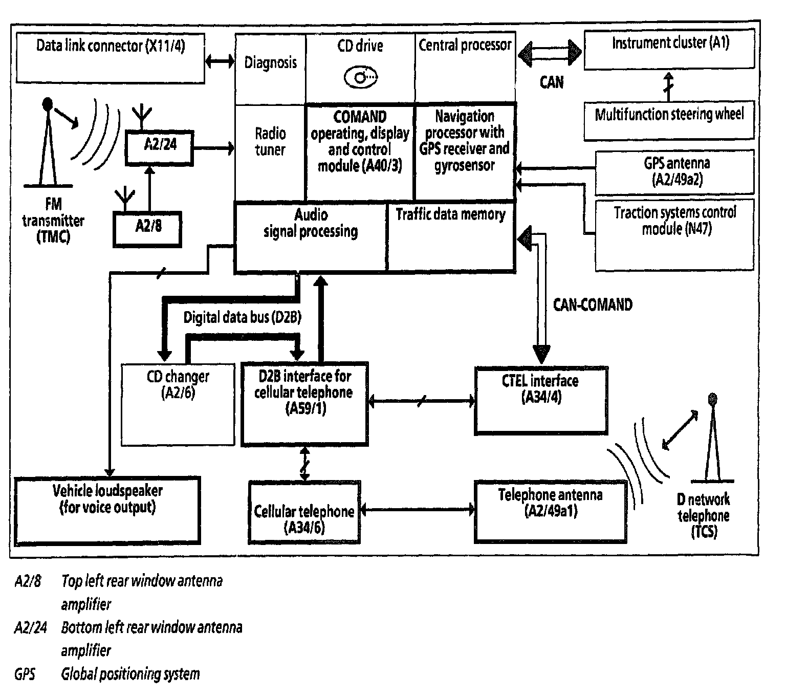 The radio receives the traffic messages via the bottom left rear window antenna amplifier (A2/24) and transmits them to the traffic data memory via CAN COMAND bus (see block diagram).
