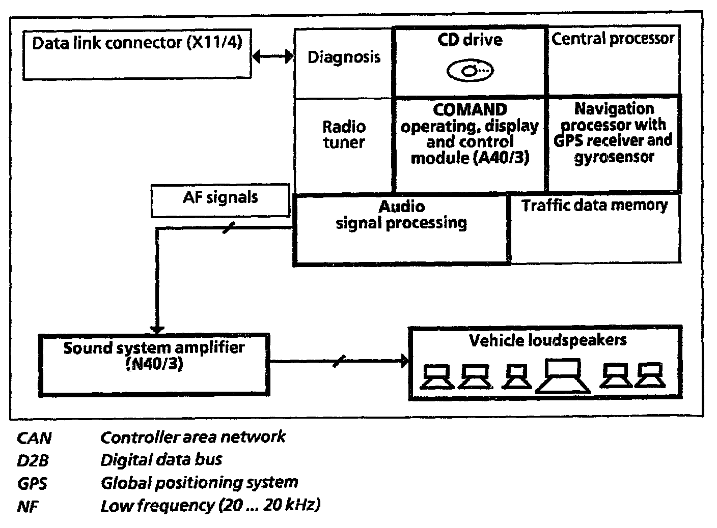 NOTE: If the vehicle is equipped with a sound system (code 81O), the voice signals are transferred as analog signals from the COMAND audio signal processing circuit to the sound system amplifier (N40/3) where they are amplified and then output on the vehicle loudspeakers (see block diagram).