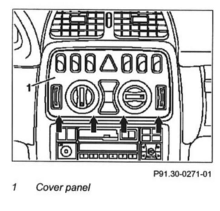 1 Unclip cover panel (1) (arrows), pivot up and remove
