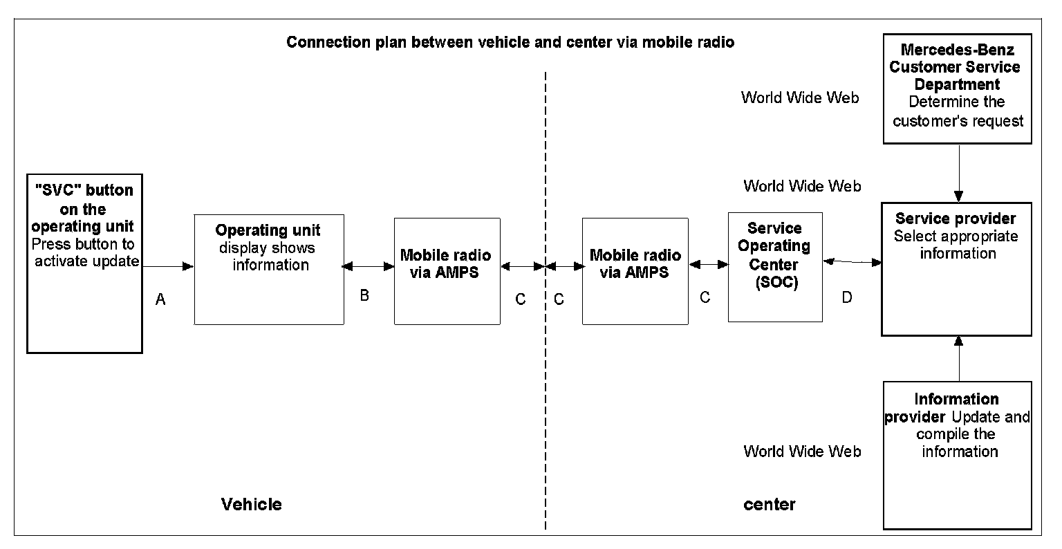 At the service center (Service Operating Center (SOC)) the customer profile is used as a set of criteria for selecting information. The requested information is put together by the information provider and sent to the vehicle via the service center (Service Operation Center (SOC)). The data transmitted appear on the display of the COMAND operating, display and control unit (A40/3).