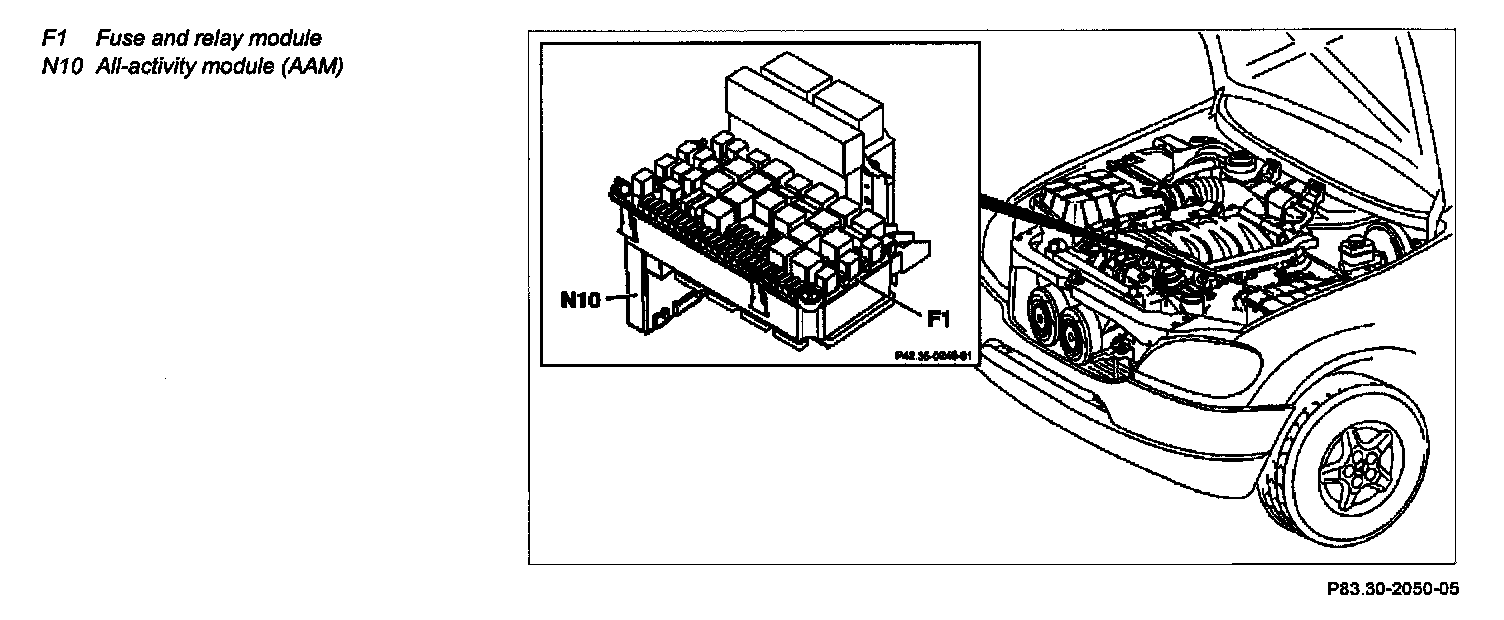The all-activity module (AAM) (N10) is plugged into the fuse and relay module (F1) from below.