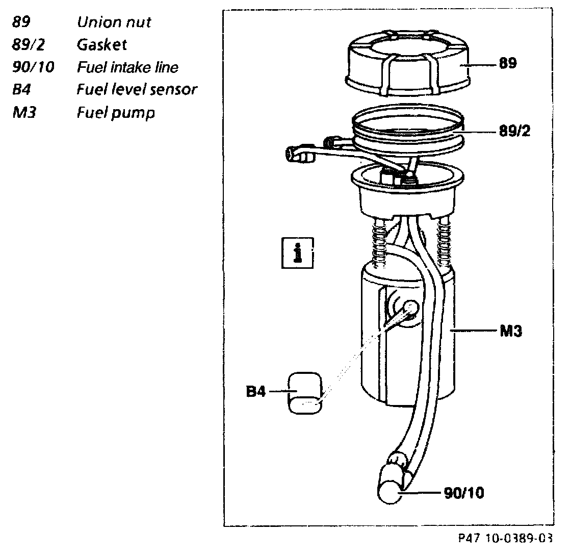 NOTE: Fuel level gauge sensor (B4) and fuel pump (M3) form a single unit and can therefore not be removed separately.