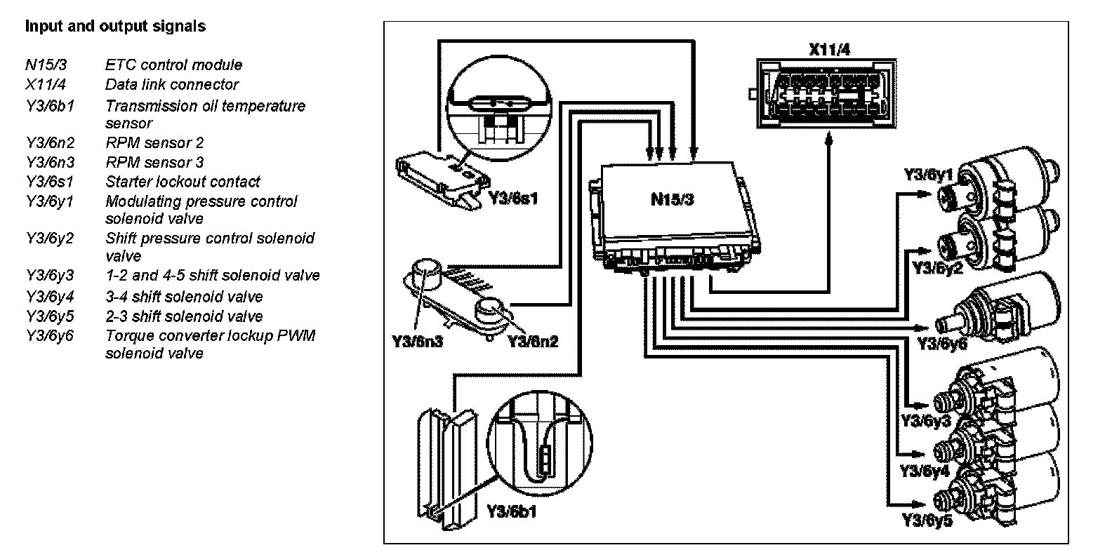 The ETC control module (N15/3) determines the instantaneous operating condition of the vehicle and controls all gearshift sequences taking into account the ease of shifting and the driving situation. This involves receiving, converting and transmitting various digital and analog signals.