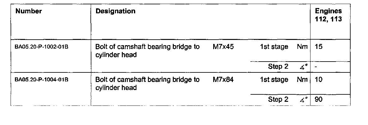 Camshaft bearing bridge tightening specifications