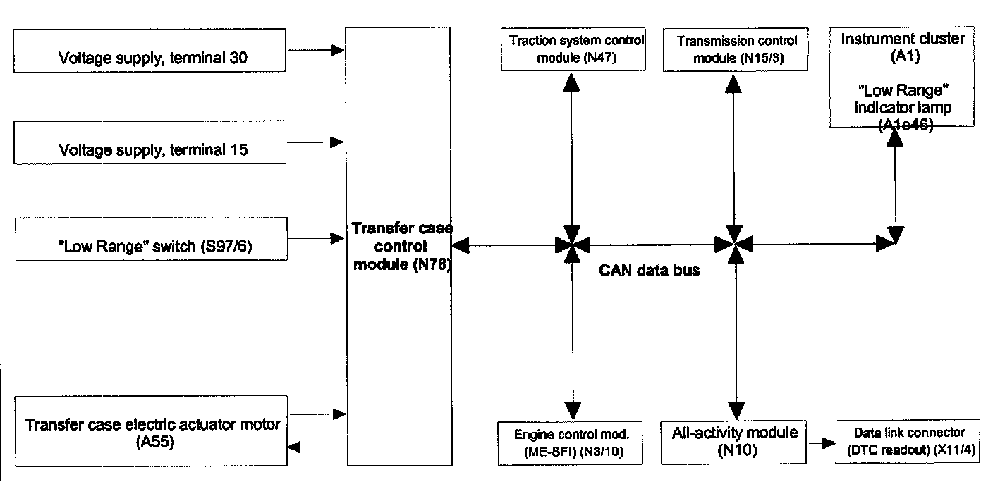 The transfer case control module (N78) receives input signals from the "Low Range" switch (S97/6) and the voltage supply from the battery (terminal 30) and from the ignition lock (terminal 15). In addition there is a connection to the engine control module (N3/10) via the CAN data bus as well as to the traction system control module (N47), transmission control module (N15/3) and the instrument cluster (A1).