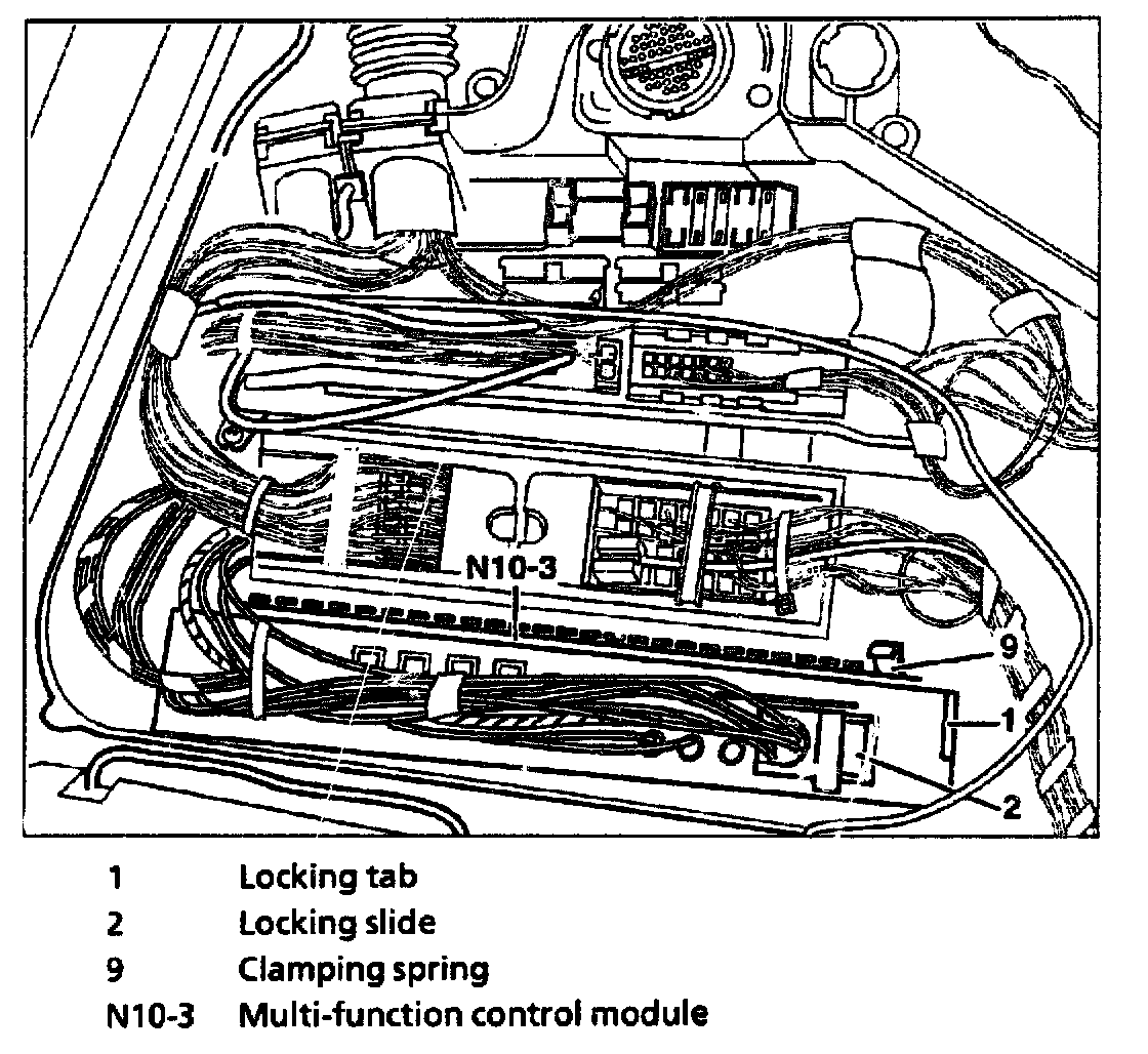 4 Press clamping spring (9) to side and remove multi-function control module (N10-3) from control module box.
