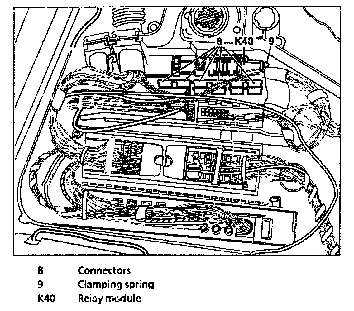 2 Press clamping spring (9) to side and remove relay module (K40) from control module box.