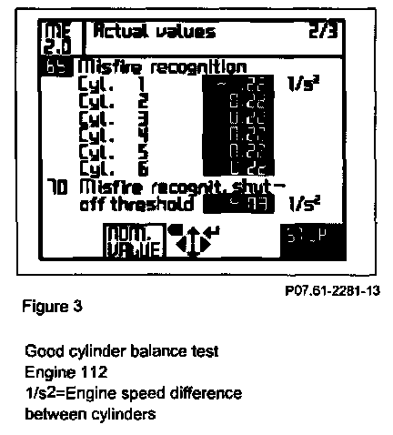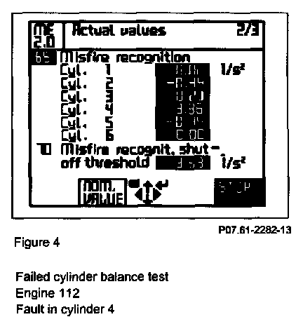 The cylinder balance test must be performed at idle. If the misfire recognition shutoff threshold is exceeded, a fault will be stored and at the same time the fault count will increases. After repairs, clear the diagnostic memory.