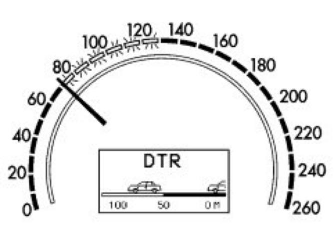 If the Distronic detects a vehicle ahead driving at a lower speed, further segments between the desired speed (e.g. 130 km/h) and the speed of the vehicle ahead (e.g. 80 km/h) light up. At the same time the system reduces the speed of the own vehicle until the speed of the vehicle ahead is reached. During this time, the vehicle ahead is shown in the display.