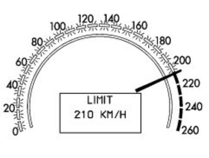 When the limiter is active, the message "LIMIT" appears briefly in display together with the speed limit (e.g. 210 km/h).