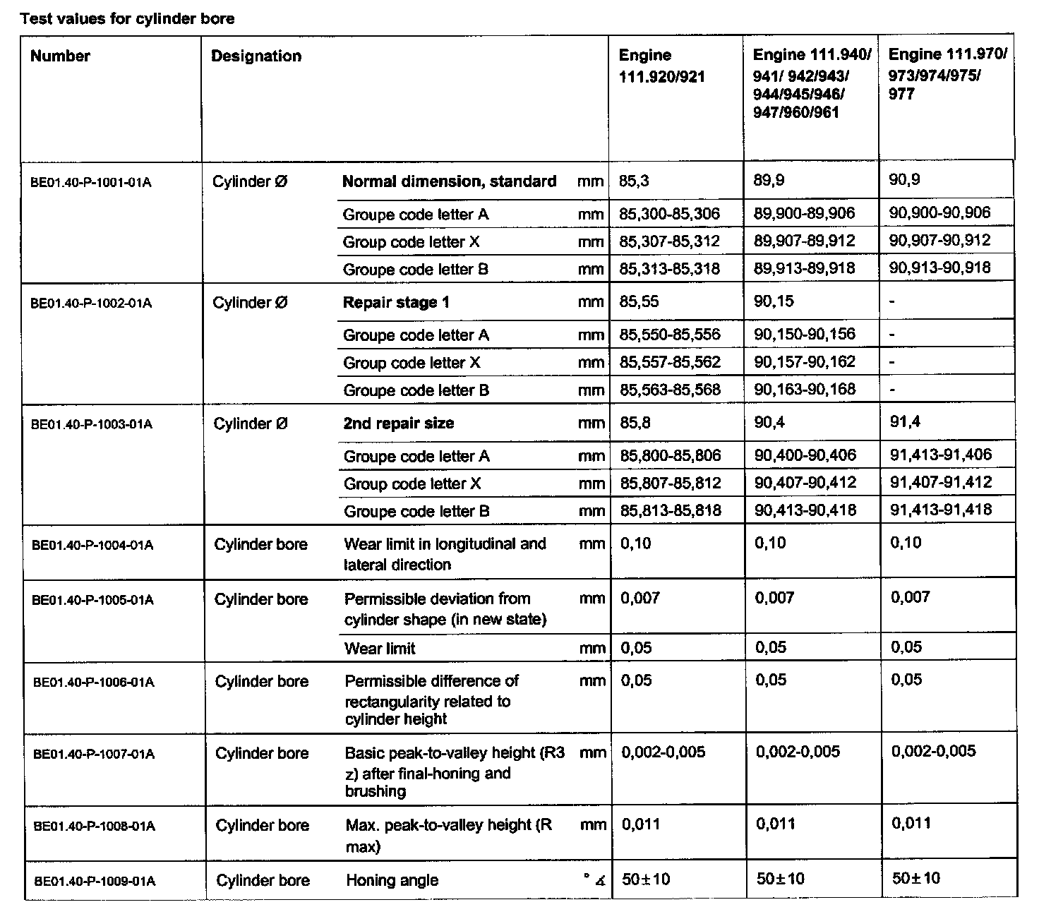 Test Values For Cylinder Bore