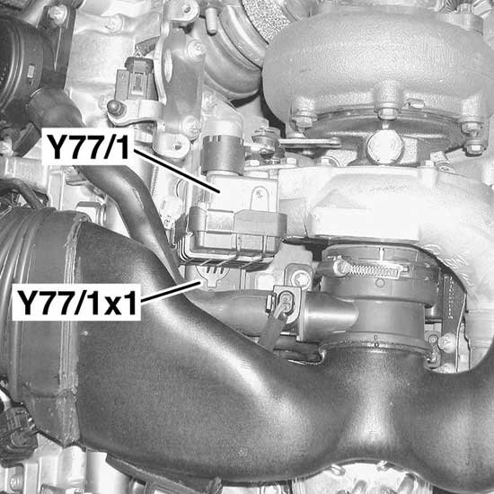 - The entire linkage from component Y77/1 (Charge pressure positioner) to the turbocharger must move visibly during the actuation.