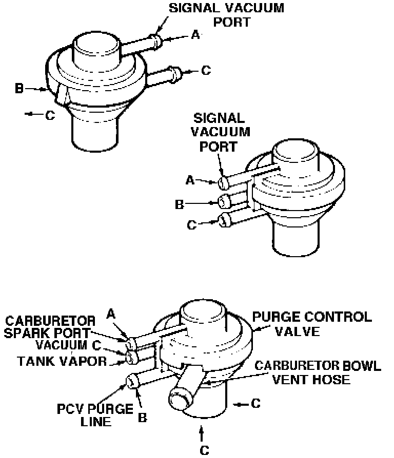 4. Return engine to idle. Strong hissing sound at purge control valve should stop if there is a port vacuum signal at valve. If strong hissing sound does not stop, check for vacuum at source port and check operation of retard delay valve(s). Repair or replace components as necessary.