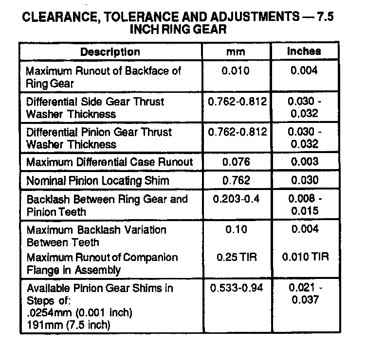 Ford 7.5 Inch, Clearances/Tolerances (Mark VII/III):