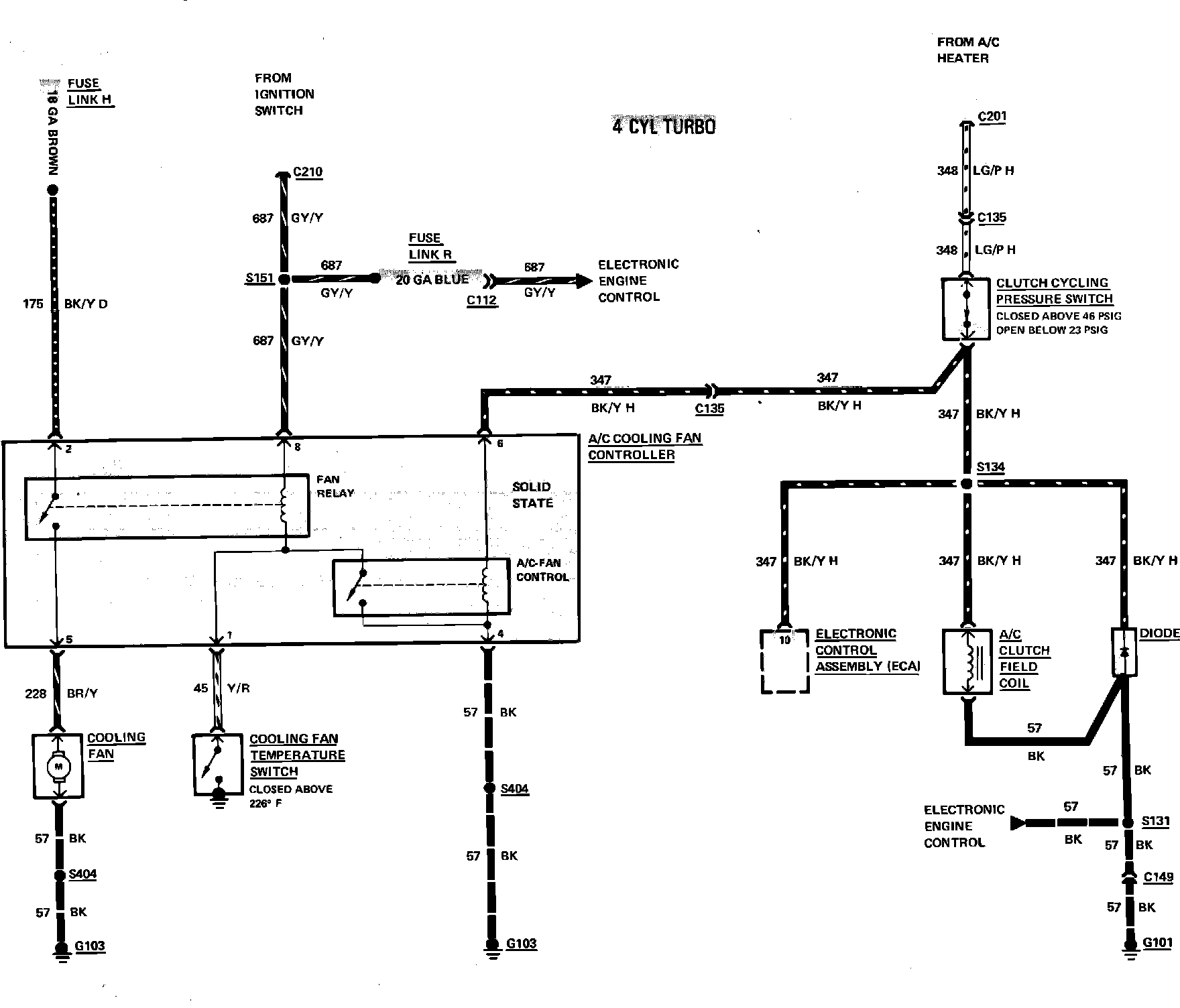 Fig. 11 Air conditioning compressor clutch & cooling fan wiring circuit. 1984 Capri & Mustang with 4 cyl engine with turbocharger: