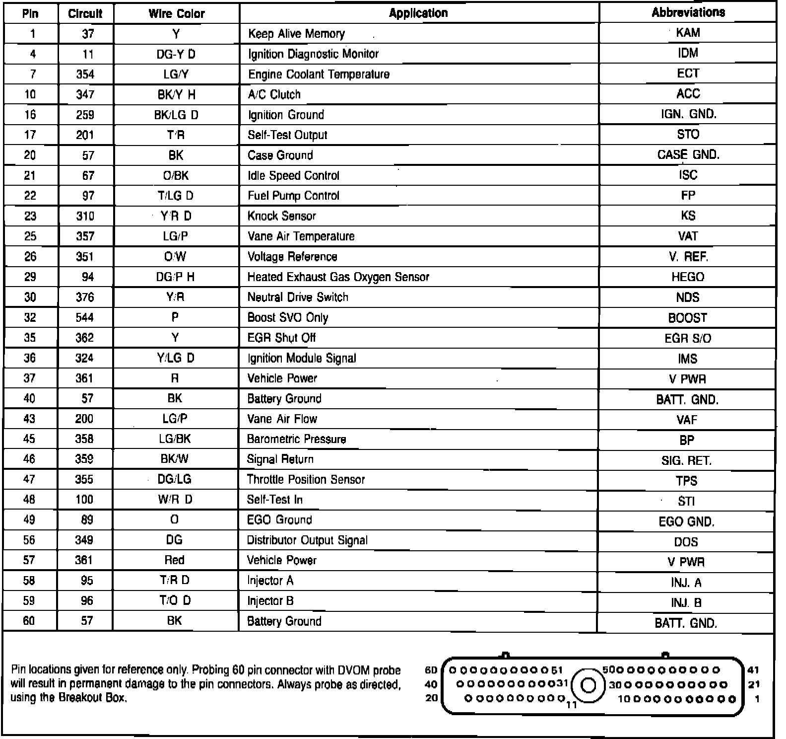 Fig. 57 EEC-IV Module Connector Pin Usage. Turbocharged EFI W/Manual Transmission & Mustang SVO: