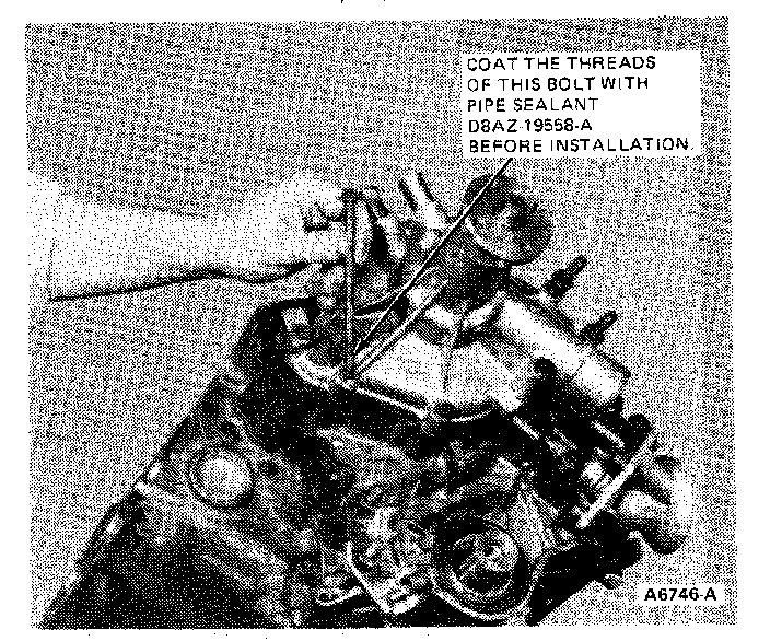 NOTE: The threads of the cover attaching bolt shown must be coated with Pipe Sealant D8AZ- 19558-A or equivalent before installation.