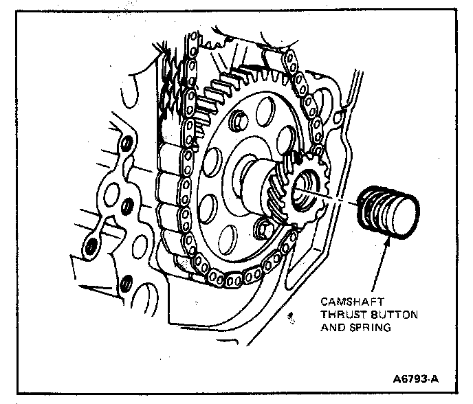 The thrust button and spring must be bottomed out in the camshaft seat and must not be allowed to fall out during installation of the front cover.
