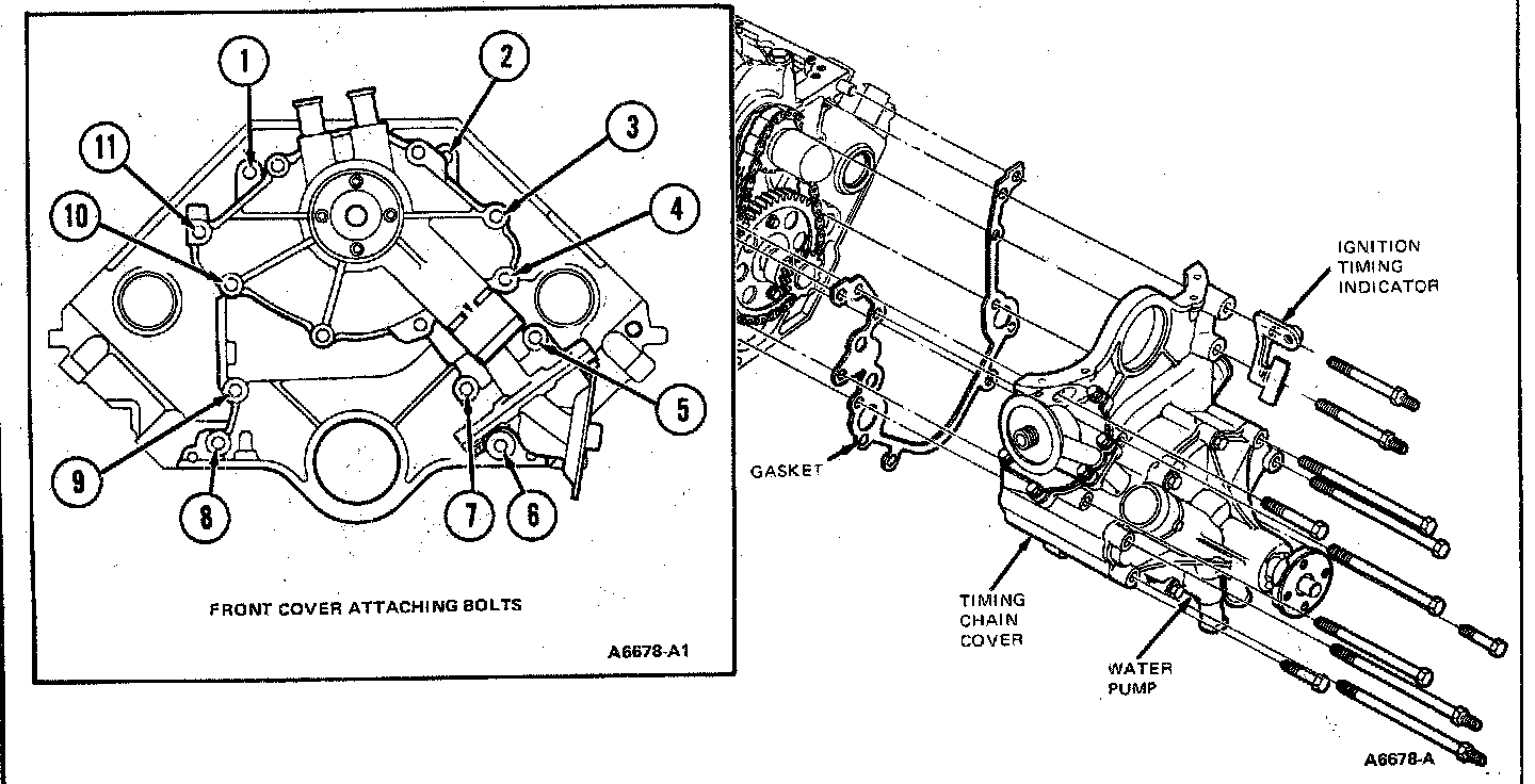 24. Remove the front cover attaching bolts. It is not necessary to remove the water pump.