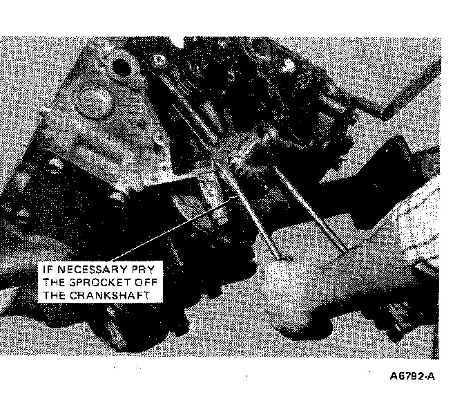 If the crankshaft sprocket is difficult to remove, pry the sprocket off the shaft using a pair of large screwdrivers positioned on both sides of the sprocket.