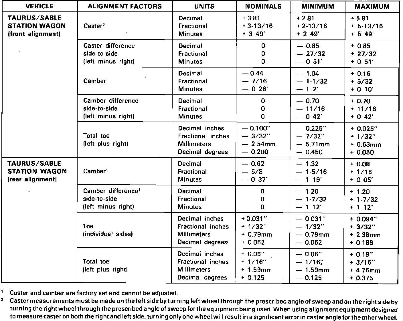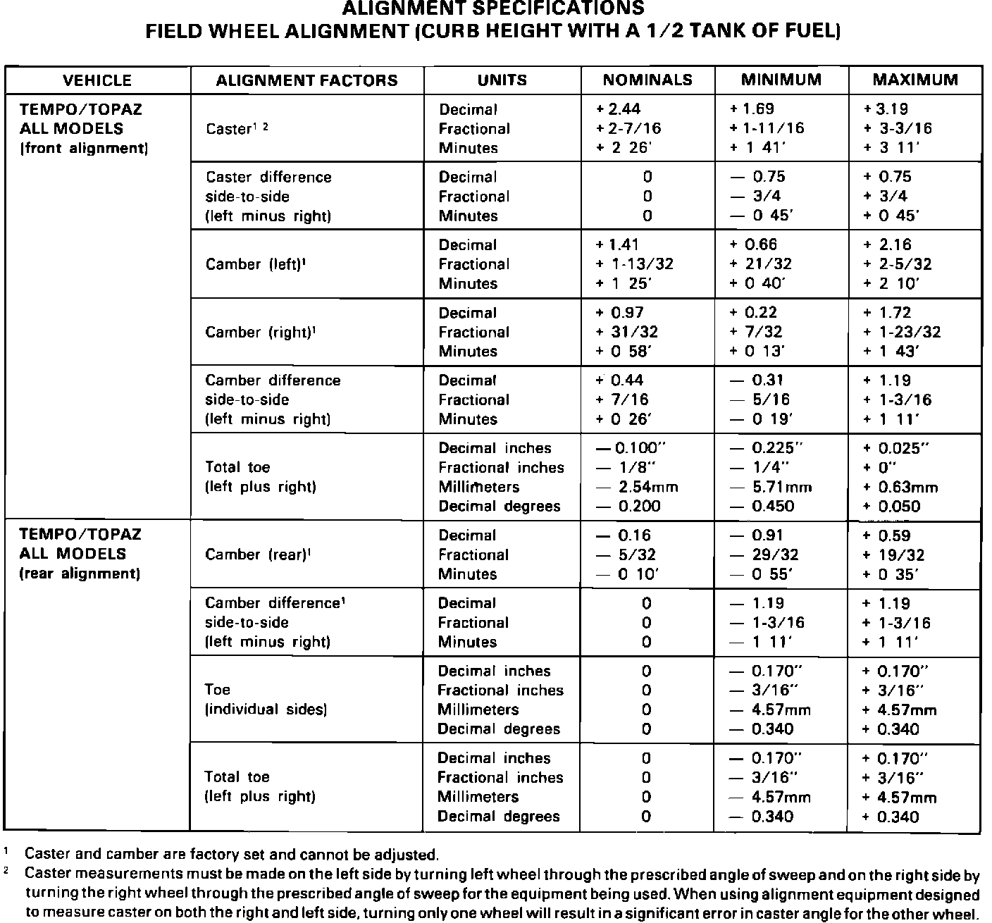 Alignment specifications shown in the 1986 Car Shop Manual have been revised as indicated in the following charts. Please mark your shop manuals to reference the new information in this TSB.