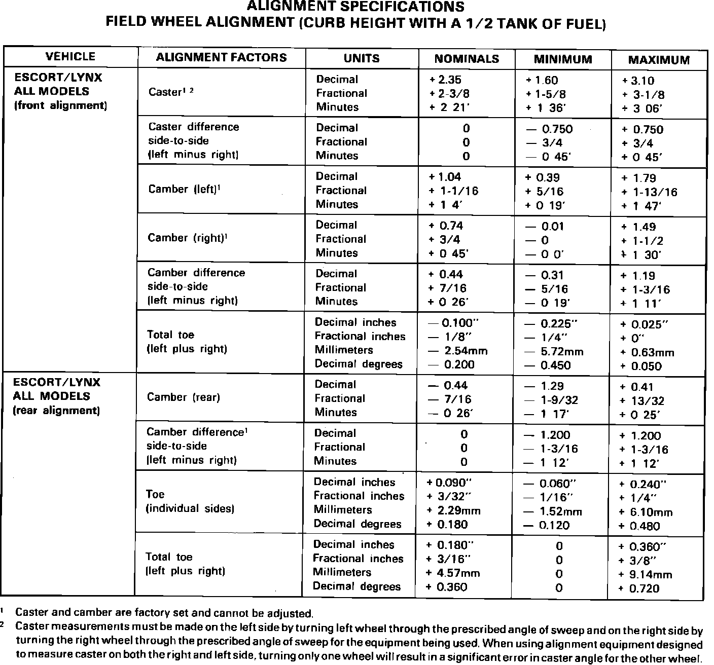 ALIGNMENT SPECIFICATIONS