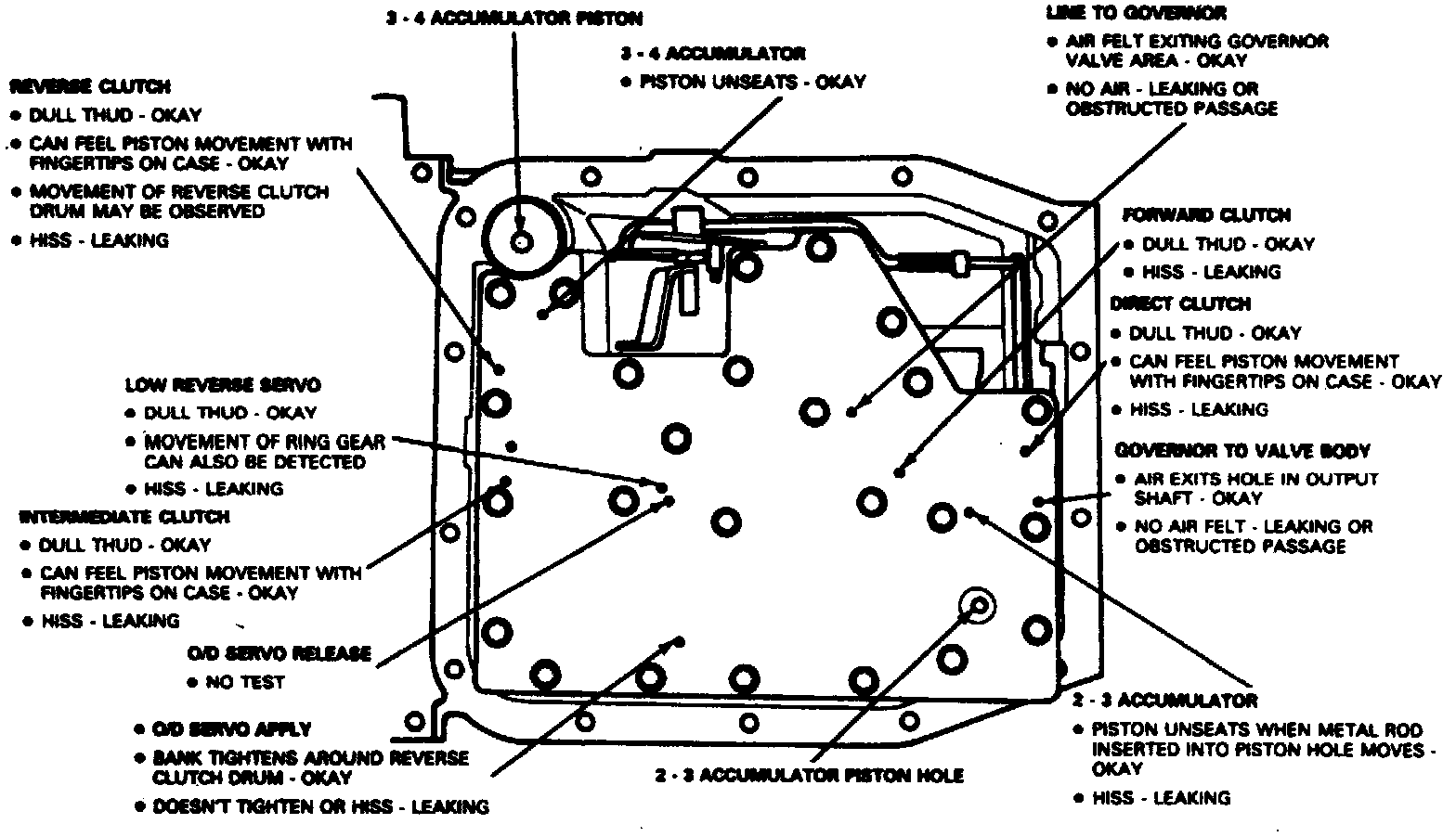 6. Apply air pressure to 2-3 accumulator apply passage and check whether accumulator piston unseats by inserting small metal rod into 2-3 piston hold. When piston unseats rod will move and a dull thud can be heard when piston applies.