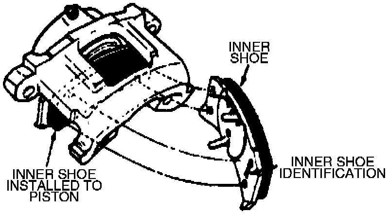 3. Install inner shoe and lining assembly on caliper piston, Fig. 9. Some inner brake shoes are marked LH (left hand) and RH (right hand) and must be installed on the proper caliper. Use care to not bend spring clips too far during installation in piston, otherwise distortion and rattles may result.