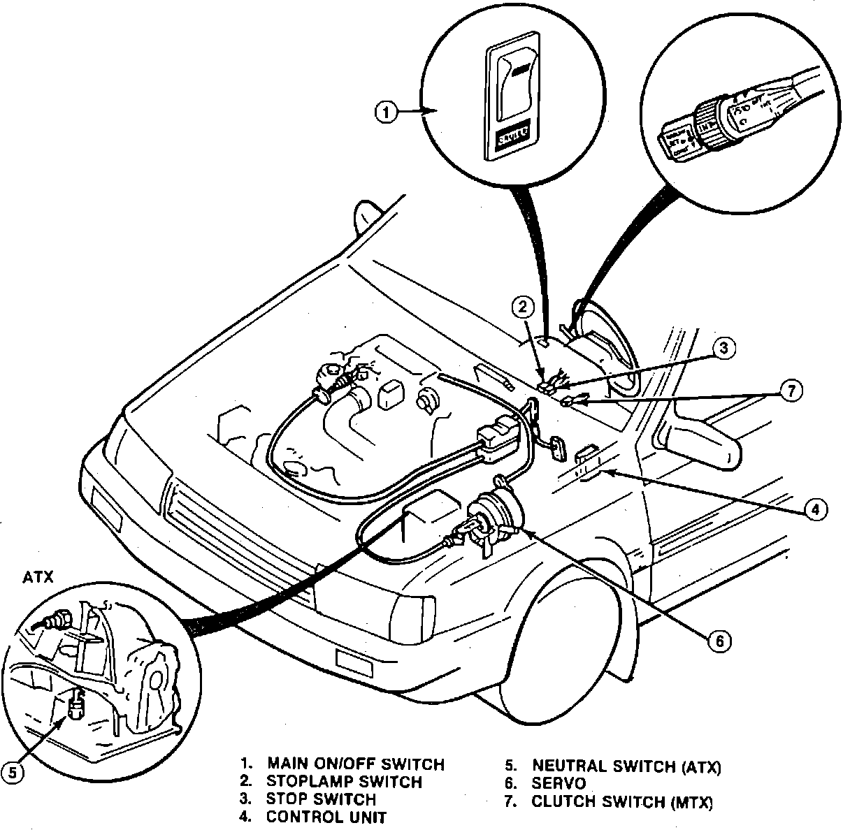 The speed control system consists of operator controls, a servo (throttle actuator) assembly, speed sensor, main On/Off switch, clutch switch, stop lamp switch, neutral switch and the control unit.