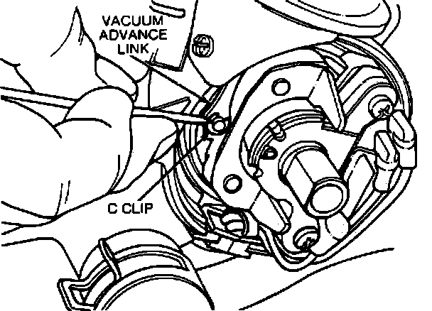 3. Remove the C-clip while securing the vacuum advance link to the stator plate.