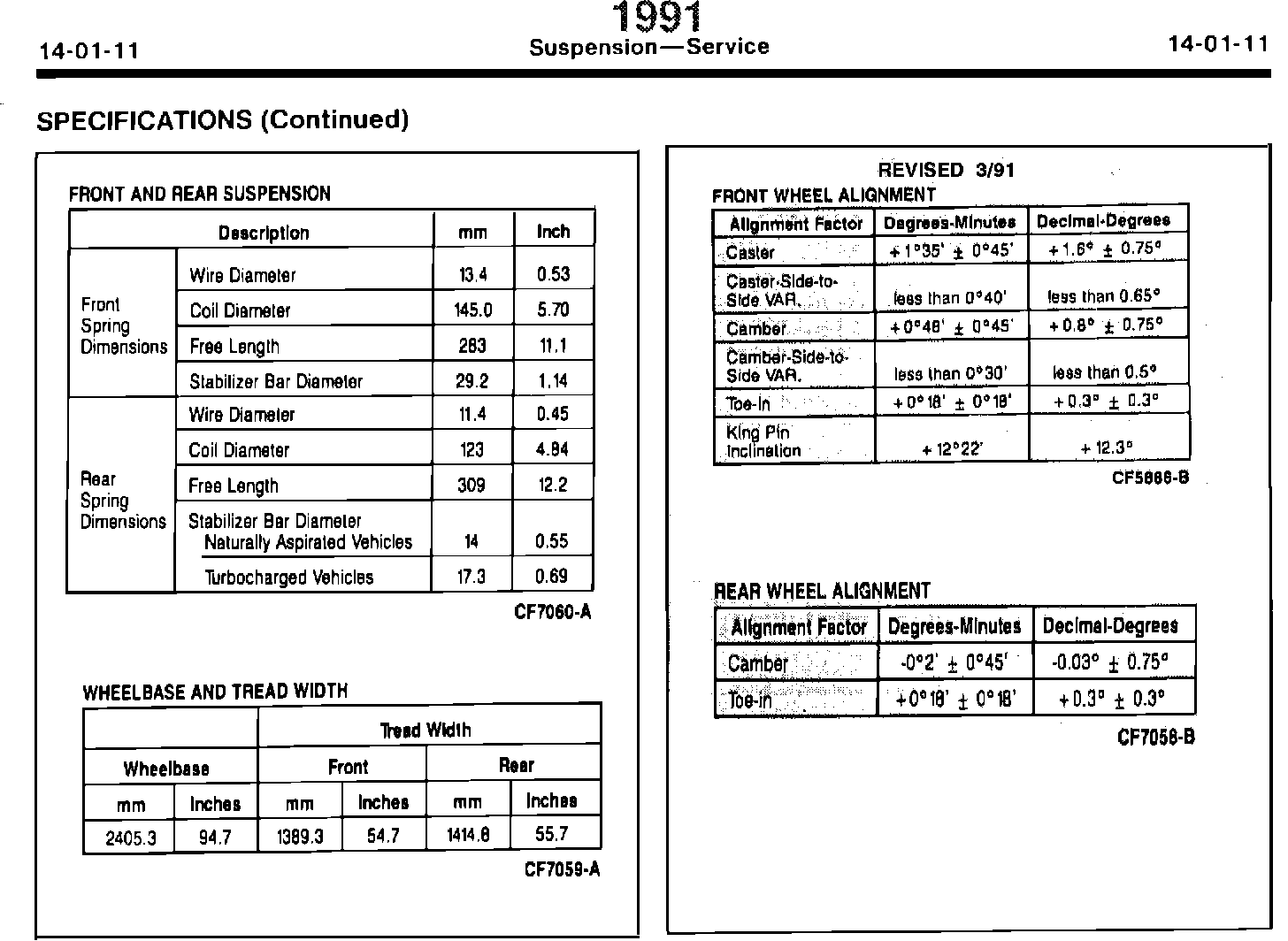 ISSUE: The Front Wheel and Rear Wheel Alignment charts under Specifications on Suspension-Service in the 1991 Capri Shop Manual, Page 14-01-11, have been updated.
