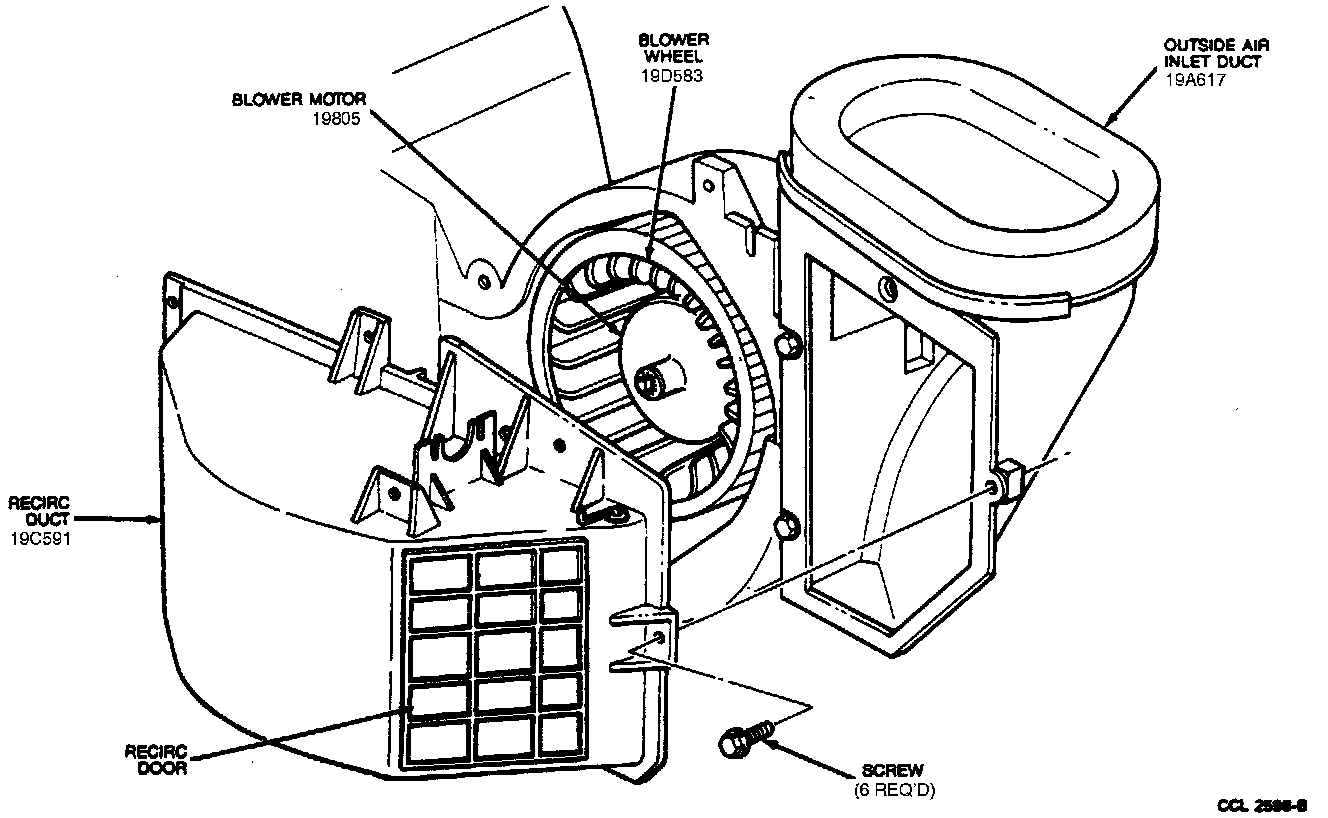 2. Install the six screws retaining the recirculating duct to the heater case.