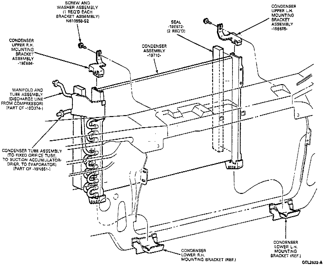 NOTE: Whenever a condenser is replaced, it us also necessary to replace the suction accumulator/drier.CAUTION: If a condenser leak is suspected, the condenser must be leak tested before it is removed from the vehicle.