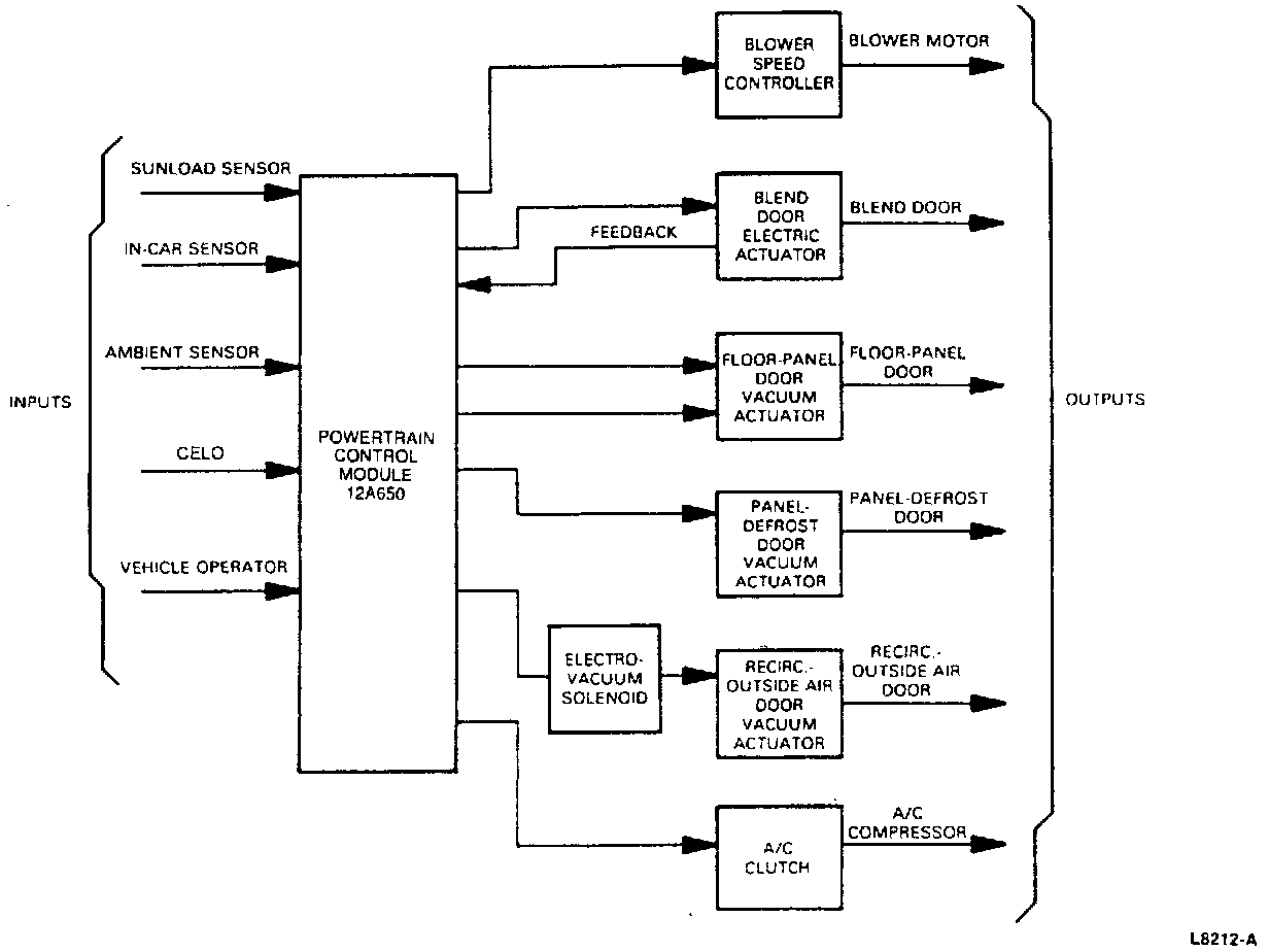A small DC electric motor or actuator is used to operate the temperature blend door. Vacuum actuators are used to control each of the three remaining air distribution doors. A feedback circuit is used in the blend door actuator to supply the control assembly with blend door position information. The blower motor is controlled by the control assembly through the blower speed controller. The blower speed controller is necessary to react to the low power signal from the control assembly to provide high power signal required to drive the blower. The System Response Chart shows the control assembly response to the function selections.