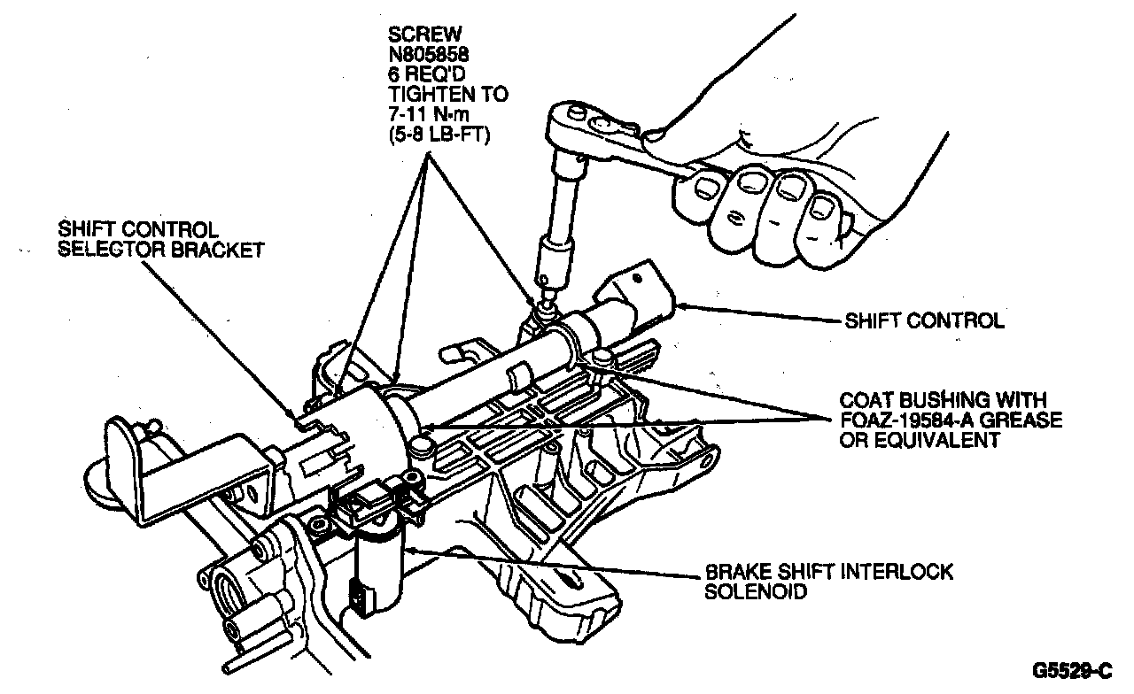 18. Install shift control tube assembly (column shift only). Coat bushings with FOAZ-19584-A grease or equivalent. Tighten screws to 7-11 N.m (5-8 lb-ft)