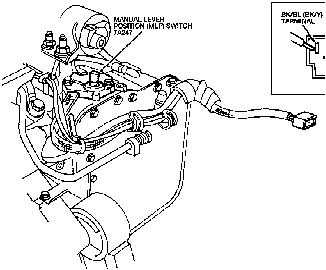 Using Rotunda 73 Digital Multimeter 105-00051, measure the resistance between the "BK/BL" and "BK/R"("BK/Y"and"BK/R"on component side) wire terminals at the connector leading to the Manual Lever Position (MLP) switch. Move the shift control selector lever through all positions.