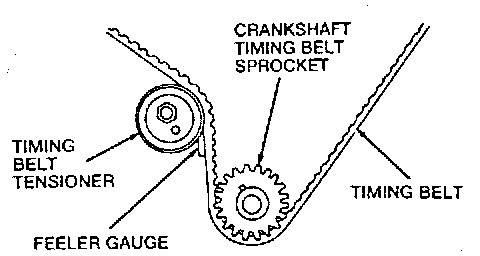 b. Turn crankshaft clockwise to position feeler gauge between timing belt tensioner and timing belt.