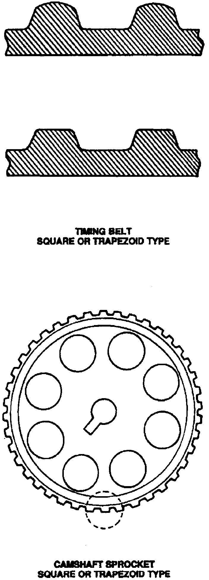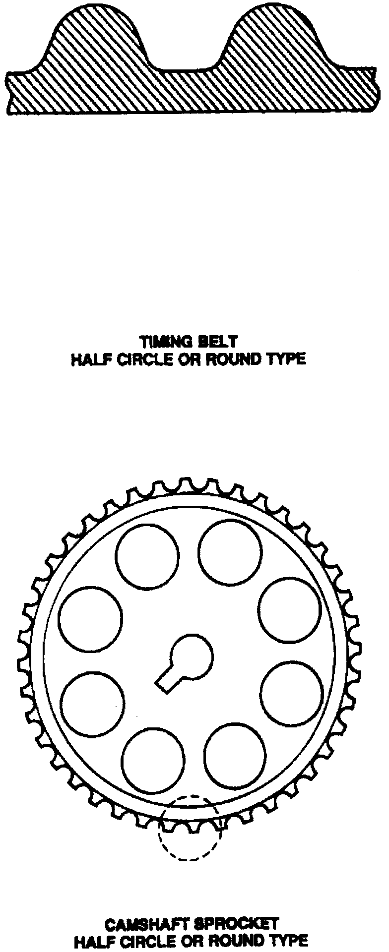 CAUTIONS: 1993 and 1994-96 timing belts are non-interchangeable. 1993 belt design was changed from a square or trapezoid type to a half circle or round type for 1994-96, This design extends service life of timing belt from 60,000 miles to 105,000 miles. Failure to install correct timing belt may result in a "whining" noise from engine compartment after replacement.