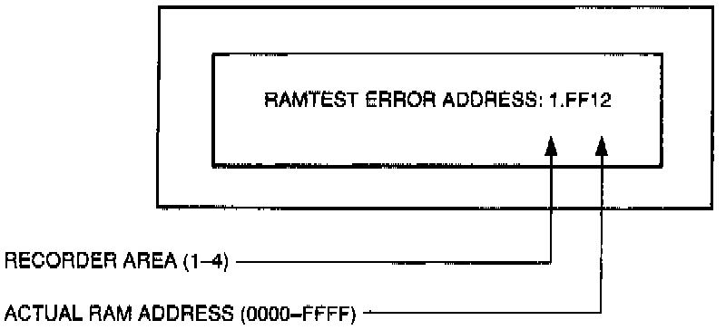 The NGS Scan Tool RAMTEST tests the recorder RAM area. The actual RAM Address indicates the location of the NGS Scan Tool fault. If a key is pressed, the RAMTEST continues with the next RAM ADDRESS. Each time a failure is detected in the NGS Scan Tool recorder RAM area, the screen display shown will be displayed.