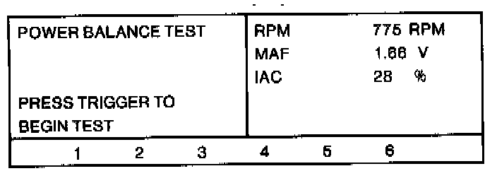 Fuel injectors to any or all of the six cylinders can be initialized by pressing key number 3 for cylinder # 1, key number 4 for cylinder #2, etc. Engine RPM, MAF sensor voltage and IAC valve opening are displayed. When this test is completed, press CANCEL to return to Screen Display # 16. Turn the menu dial to highlight COOLING FAN. Press TRIGGER. Screen Display #22 will appear.